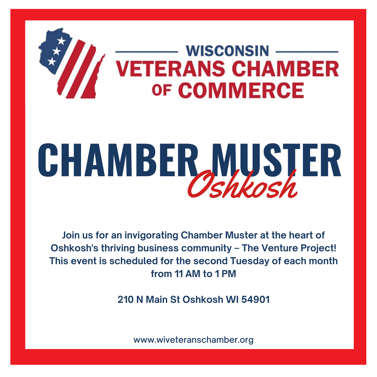 Join us for an invigorating Chamber Muster at the heart of Oshkosh's thriving business community – The Venture Project! This event is scheduled for the second Tuesday of each month from 11 AM to 1 PM.